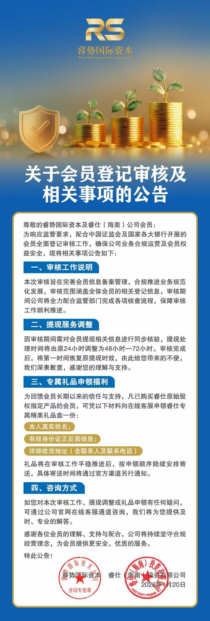 为响应监管要求,配合中国证监会及国家各大银行开展的会员全面登记审核工作,确保公司业务合规运营及会员权益安全,现将相关事项公告如下: